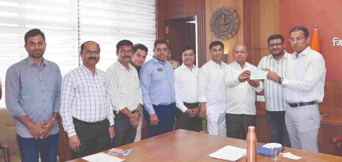 ५२ हजार १११ रुपयाचा धनादेश जिल्हाधिकारी यांच्याकडे सुपूर्त करताना आमदार संग्राम जगताप. समवेत प्रितेश शहा, राजेश गुगळे, सचिन ओस्तवाल, सुदीप अग्रवाल, रमेश जाधव, दिलीप दाते, साहिल ओस्तवाल, बाळासाहेब शेटे, प्रताप काळे, दीपक देशमुख आदी उपस्थित होते. (छाया : लहू दळवी)